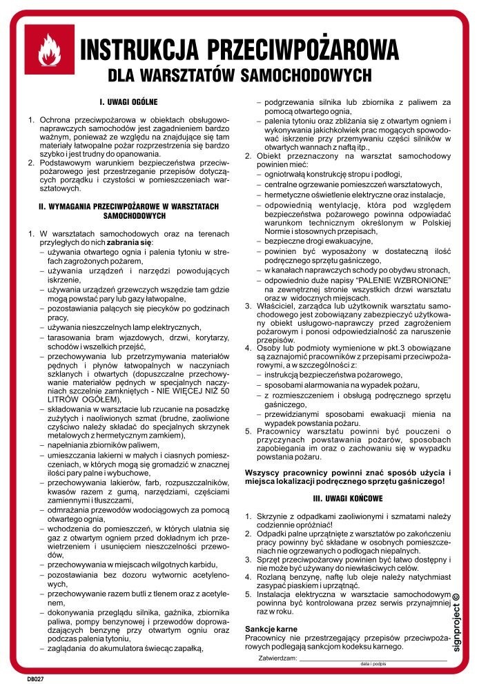 Instrukcja PPOŻ. DB027 to specjalistyczny dokument przeznaczony dla warsztatów samochodowych, który kompleksowo reguluje zasady ochrony przeciwpożarowej w tego typu obiektach. Produkt został opracowany zgodnie z obowiązującymi przepisami prawa oraz normami bezpieczeństwa, co gwarantuje pełną zgodność z wymogami Państwowej Straży Pożarnej. Instrukcja zawiera szczegółowe wytyczne dotyczące zapobiegania pożarom, postępowania w sytuacjach zagrożenia oraz prawidłowego użytkowania sprzętu gaśniczego. Ponadto uwzględnia specyfikę działalności warsztatów samochodowych, w tym bezpieczne przechowywanie materiałów łatwopalnych i substancji chemicznych. Dokument ten jest niezbędnym elementem wyposażenia każdego warsztatu, który dba o bezpieczeństwo swoich pracowników oraz mienia. Dzięki Instrukcji PPOŻ. DB027 możliwe jest skuteczne minimalizowanie ryzyka pożarowego oraz szybka i prawidłowa reakcja w przypadku wystąpienia zagrożenia.